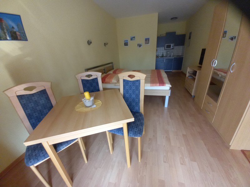 Unsere zwei gemütlichen Nichtraucher- Appartements (ca. 24 m²) für bis zu 2 Personen im Erdgeschoss unseres Hauses (im Grundriss mit Wohnung 2 und 3 gekennzeichnet) wurden liebevoll geplant, gebaut und eingerichtet. Wir möchten, dass Sie sich als unsere Gäste bei uns wohlfühlen. Im Wohn- und Schlafbereich befindet sich u.a. ein Doppelbett. Preise: Die Basis für unsere Preise ist der Mindestaufenthalt von 5 Übernachtungen in der Nebensaison und 7 Übernachtungen in der Hauptsaison. Ein Aufenthalt mit weniger Übernachtungen ist nur nach Absprache und gegen Preisaufschlag möglich.